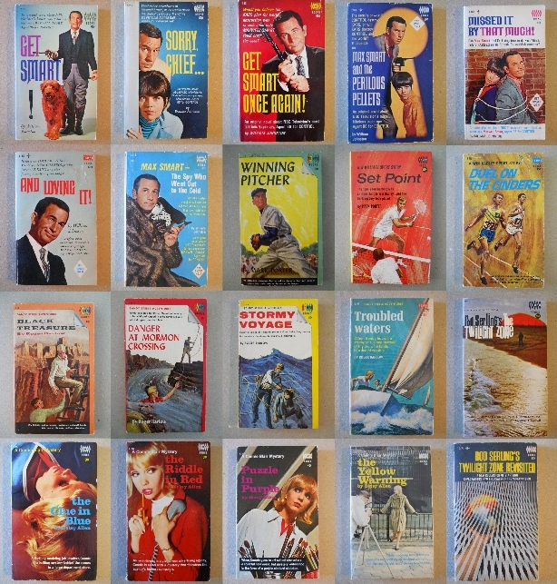 Shown above are: Get Smart Series: T-103 (#4803) Get Smart, T-119 (#4819) Sorry, Chief, T-121 (#4821) Get Smart Once Again, T-140 (#4840) Max Smart and the Perilous Pellets, T-154 (#4854) Missed It By That Much, T-159 (#4859) And Loving It, T-174 (#4874) Max Smart, The Spy Who Went Out to the Cold; Win Hadley Sports Series: T-8 (#4708) Winning Pitcher, T-113 (#4813) Set Point, T-145 (#4845) Duel on the Cinders; Sandy Steele Adventure Series: T-22 (#4722) Black Treasure, T-36 (#4736) Danger at Mormon Crossing, T-57 (#4757) Stormy Voyage, T-125 (#4825) Troubled Waters; Rod Serling's Twilight Zone Series: T-89 (#4789) Rod Serling's The Twilight Zone, T-171 (#4871) Rod Serling's Twilight Zone Revisited; Connie Blair Mystery Series: T-99 (#4799) The Clue in Blue, T-100 (#4800) The Riddle in Red, T-101 (#4801) Puzzle in Purple, T-116 (#4816) The Yellow Warning.