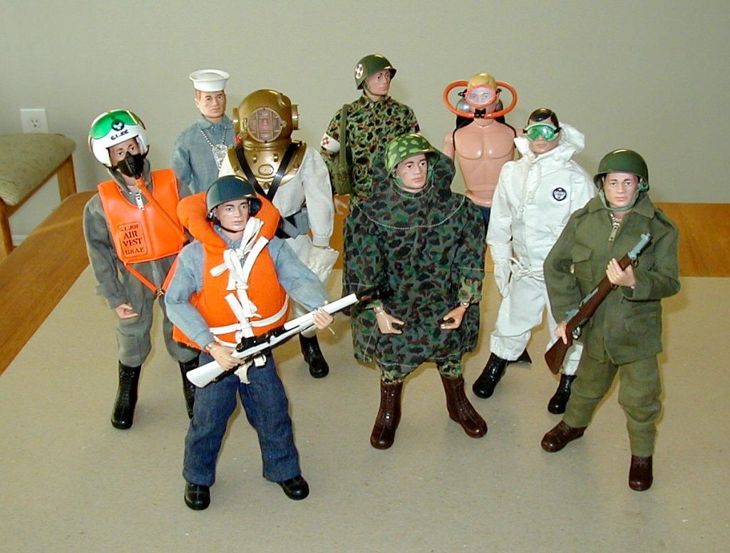 The other eight uniforms shown are: 1.) Combat Soldier in his combat field jacket, 2.) Navy Attack Sailor in his orange life jacket and blue attack helmet, 3.) Air Force Scramble Pilot, 4.) Navy Scuba Diver, 5.) Army Alpine Snow Troops, 6.) Deep Sea Diver, 7.) Communications Marine in his camouflage poncho, 8.) Marine Medic in medic helmet and arm bands.