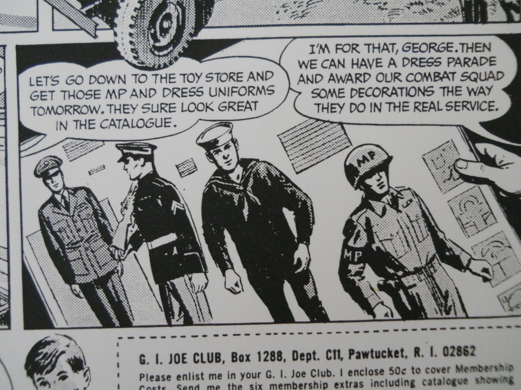 The third frame in the cartoon reveals a couple more of the GI Joe uniforms that Andy and George have in their collection. The picture below shows a close-up of that frame, along with another photo of the uniforms shown in the ad dressed on actual GI Joes.