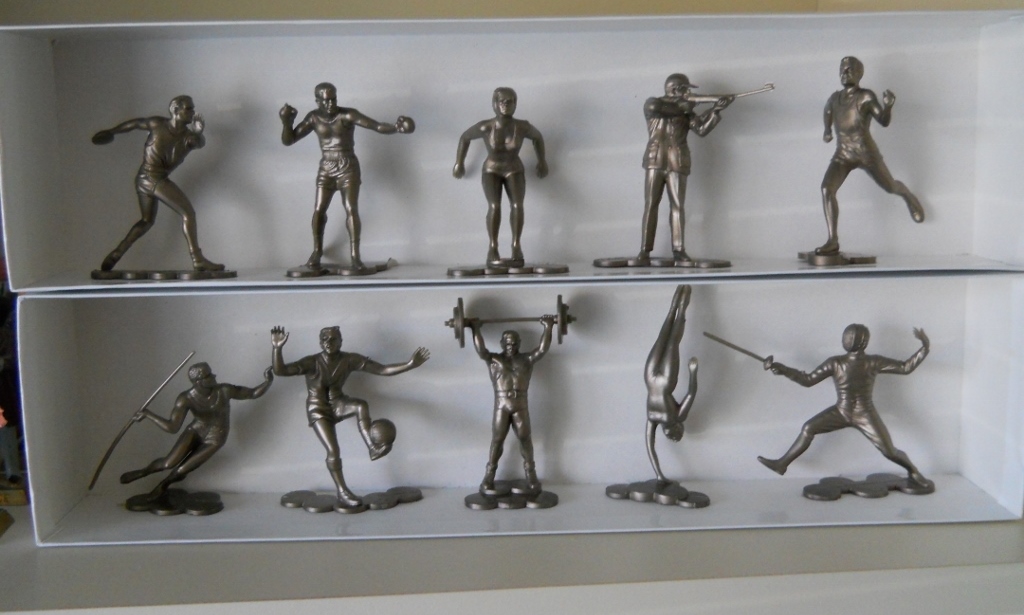 The above photo displays the ten different figures in this series. They are (from top left to bottom right): a discus thrower, a boxer, a swimmer, a sharpshooter, a runner, a javelin thrower, a soccer player, a weightlifter, a diver (or a gymnast, take your pick) and a fencer. The figures were approximately 60mm in height.