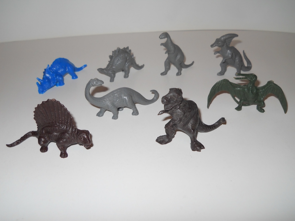 In the 1960's, dinosaurs were of just as much interest to kids as they are today. A series of dinosaurs based on the "Ajax" toy company molds were given away in Canadian cereal boxes and the photo below illustrates the eight different versions then available. These cereal premium figures came in four assorted colors (dark chocolate brown, gray, dark green and tan) as displayed in the photo below (however, the Triceratops figure shown in bright blue is a much more recent recast and is not an original figure). When I was young, I had the Tyrannosaurus Rex (in gray), the Brontosaurus (in brown), and several of the Pterodactyls in both gray and brown.