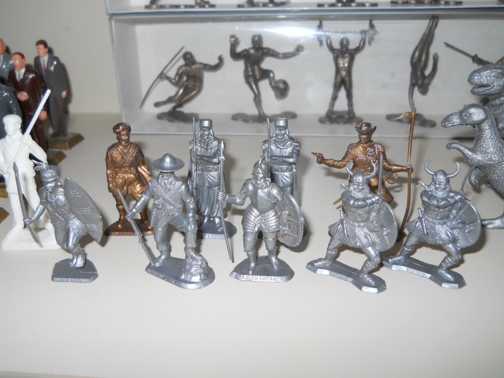 Shown below are nine Kellogg's "Soldiers of the Ages" figures in 7 different poses. These premium figures were molded in either "gold" or "silver" plastic. The photo depicts (back row to front): 1 Swiss Crossbowman, 2 Foreign Legionnaires, 1 U.S. 7th Cavalryman, 1 Zulu Warrior, 1 Mexican Warrior, 1 Spanish Conquistador and 2 Vikings.