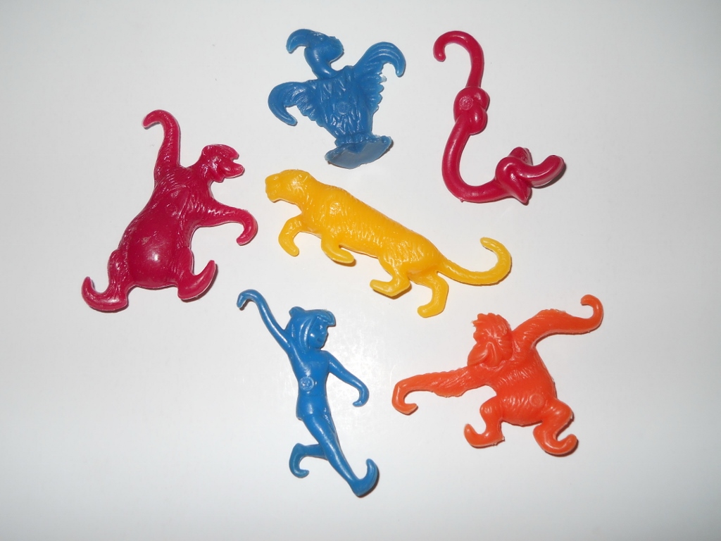 A different design of "bowl sitters" was manufactured following the release of the 1967 Disney "Jungle Book" movie. These premiums were similar in nature to the figures found in the then popular "Barrel of Monkeys" game, as they possessed curved appendages with which to link onto objects, or to one another. Shown below are the six figures in this series: Baloo, the Bear; Buzzie, the Vulture; Kaa, the Snake; Bagheera, the Panther; King Louie, the Orangutan; and Mowgli, a young boy.