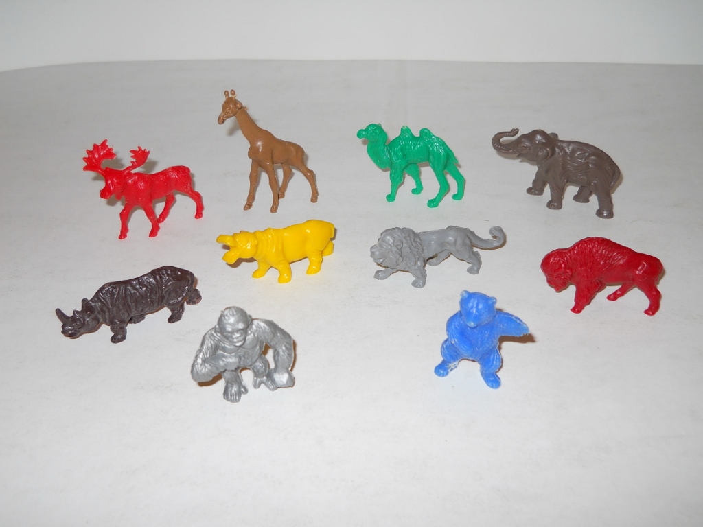 The 10 different animals in this series, as listed on the back of cereal boxes, were: 1.) bear, 2.) gorilla, 3.) bison (buffalo), 4.) camel, 5.) moose, 6.) elephant, 7.) lion, 8.) rhinoceros, 9.) giraffe, 10.) hippopotamus.
