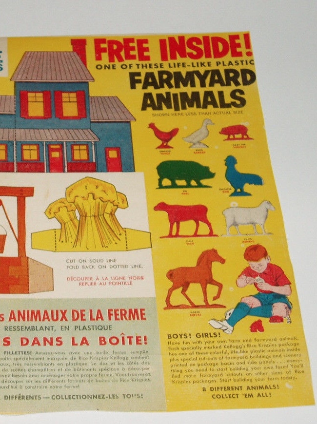 During the 1960s, Kellogg's "Rice Krispies" cereal boxes contained one of eight different plastic farmyard animals. The photo below displays these animals in assorted colors. Also shown below is the back of a Rice Krispies box illustrating them.
