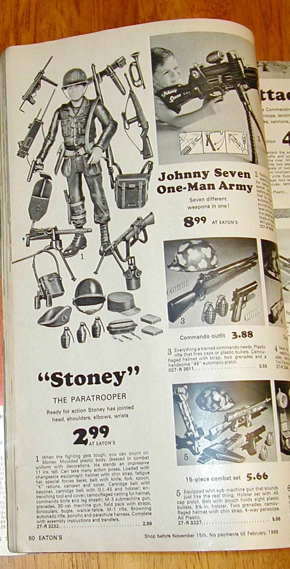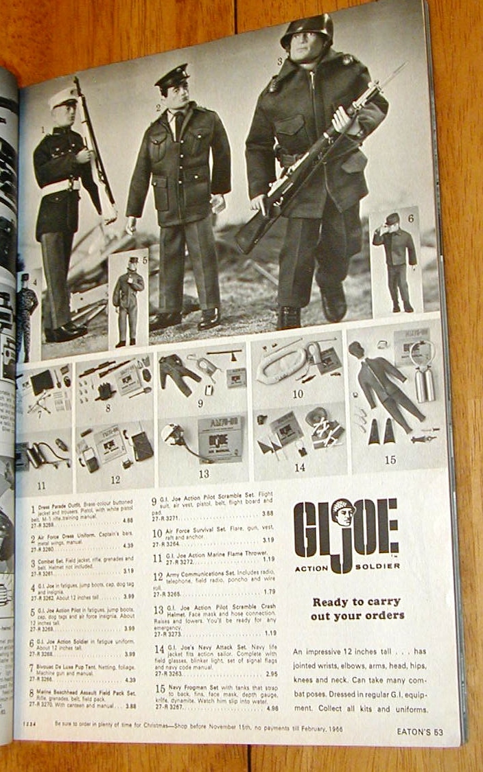 Illustrated below are the front covers of the 1963 Eaton's and the 1963 Simpsons-Sears Christmas catalogues. These catalogues were published prior to the manufacture of GI Joe and the coining of the term "action figure" and, as such, no action figures appear in either catalogue.