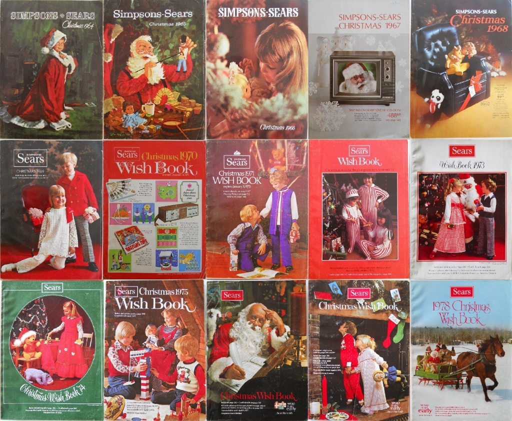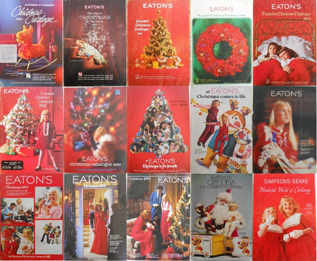 Illustrated below are the front covers of the fourteen 1963-1976 Eaton's Christmas catalogues and the sixteen 1963-1978 Simpsons-Sears Christmas catalogues.