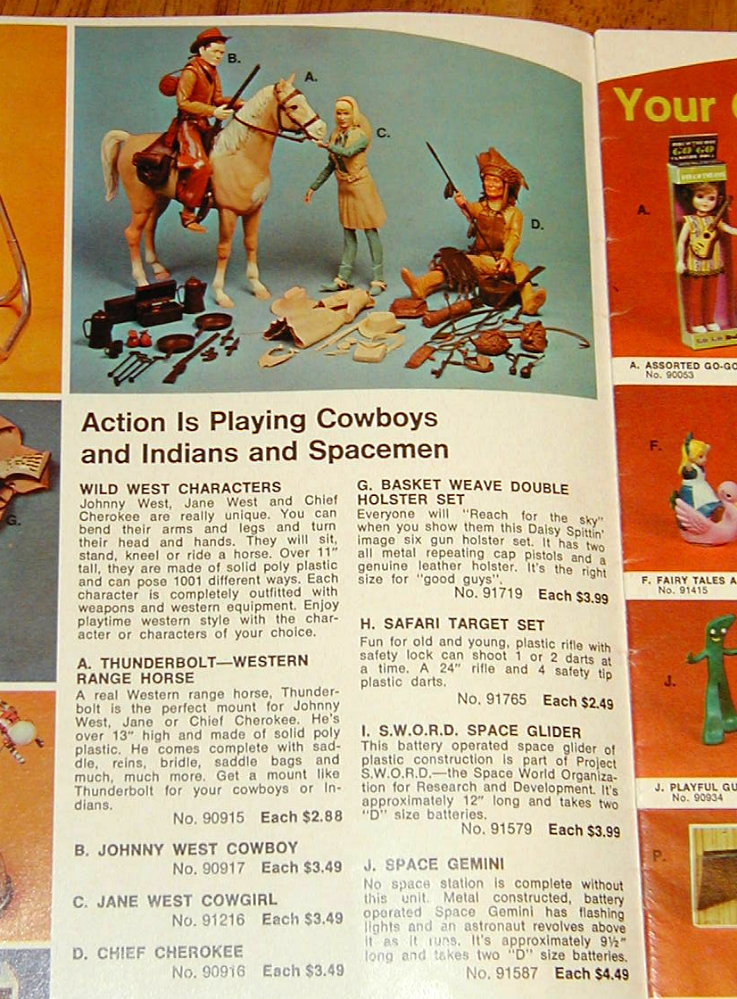 1968 U.S. Sears - Action Figures: GI Joe, Marx Johnny West, Jane West, "Josie West" (states text in catalog, but Janice is pictured), Comanche, Flame, Pancho Pony, Flick and Flack, Mattel Captain Lazer.