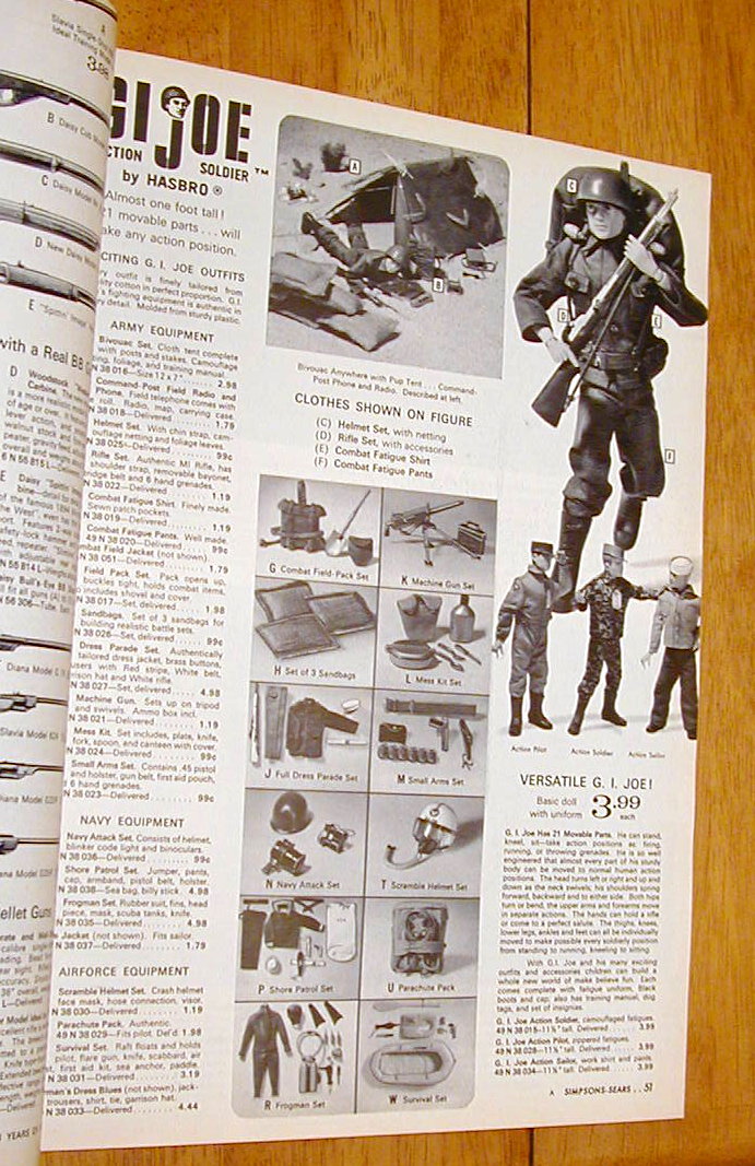 Action figure data, originally published in U.S. Sears Christmas catalogs (also widely known as "Wish Books") has been taken from the publication: The Big Toy Box at Sears, Copyright 1997 by Sears, Roebuck and Co. and Classic Toy Soldiers, Inc.. This publication includes select pages from the "Toys, Dolls and Games" sections of U.S. Sears Christmas catalogs ranging from 1951-1969. The information extracted for comparison purposes on this website is limited to the 1964-1969 era. In addition, since the Sears Toy sections do not necessarily appear in their entirety, we cannot guarantee that specific action figure data may not be missing in any given year as a result.