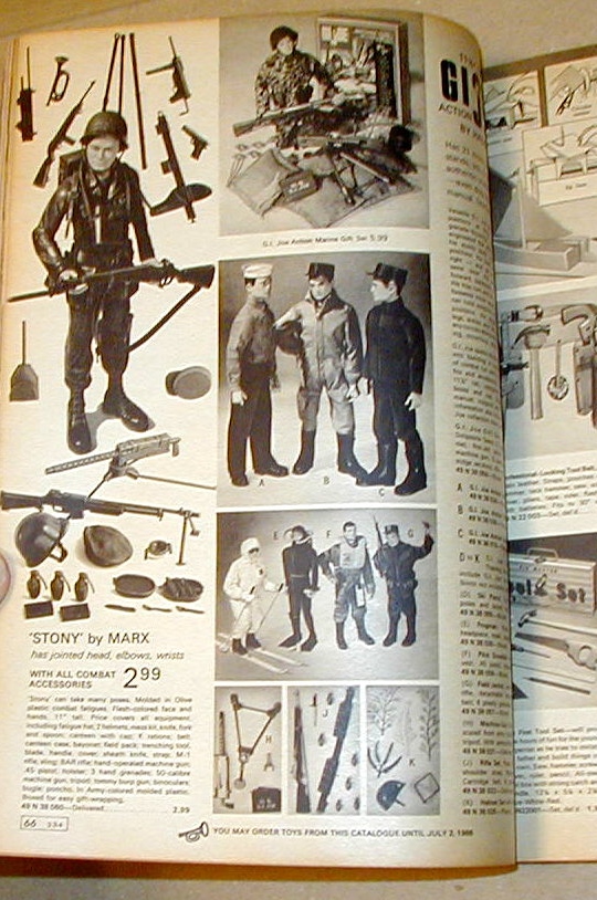 Shown below is Page 66 of the 1965 Simpsons-Sears Christmas catalogue. It displays GI Joe Action Sailor, Action Pilot, Action Soldier and the Action Marine Machine Gun Emplacement Gift Set. It also shows Marx's Stony Smith, soldier, as having "jointed head, elbows and wrists," no bendable knees yet.