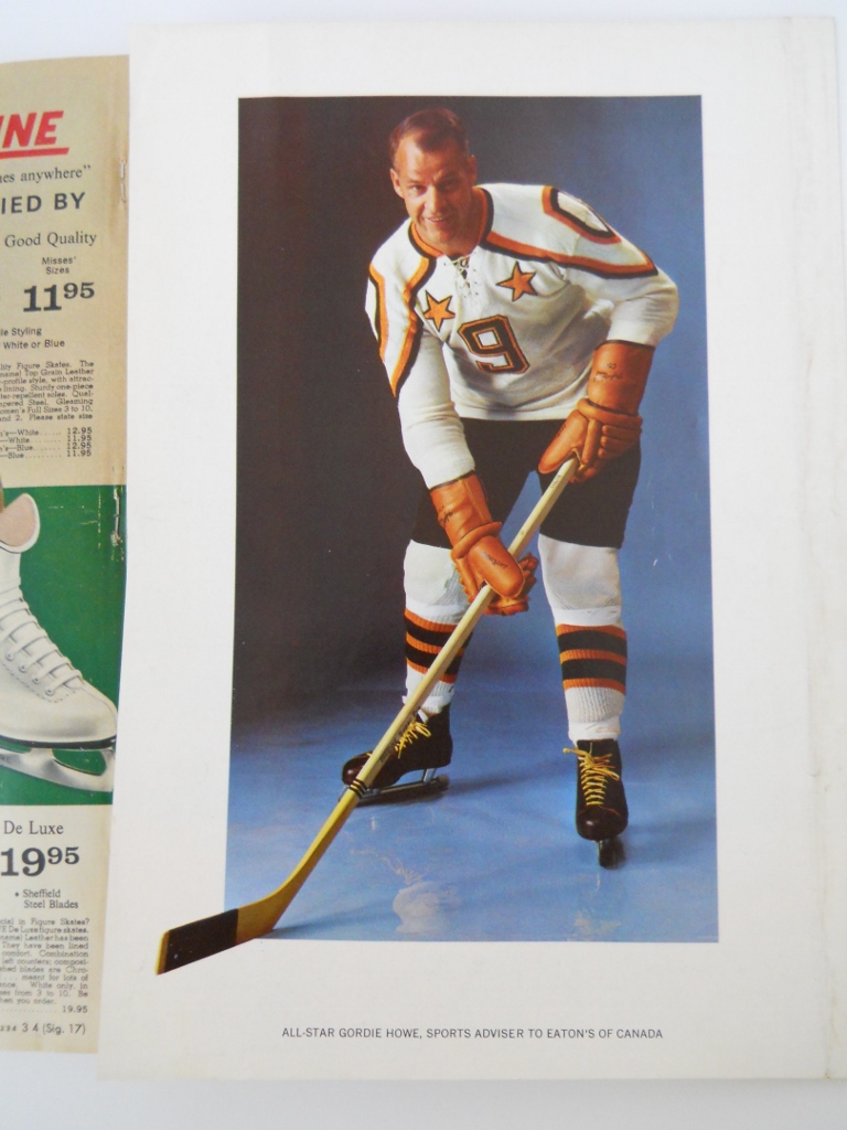 It is interesting to note that the inside back cover of the 1964 Eaton's Christmas catalogue contained a color photo pin-up of hockey legend, Gordie Howe. This pin-up could be removed without harming the rest of the back cover of the catalogue due to the pin-up's "fold-out" nature. The inclusion of a "fold out" front or back cover was a common practice on some catalogs in the 1960's, but it was usually intended to display additional merchandise; the pin-up concept was only a one-time occurrence.