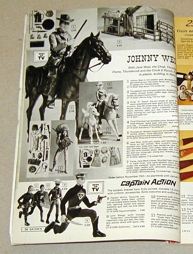 Shown below is a photo of page 34 of the 1967 Eaton's Christmas catalogue that shows the first three characters and the first three horses in the Marx Johnny West series, It also displays an add for Ideal's Captain Action that shows the Lone Ranger, the Phantom and Superman outfit sets.