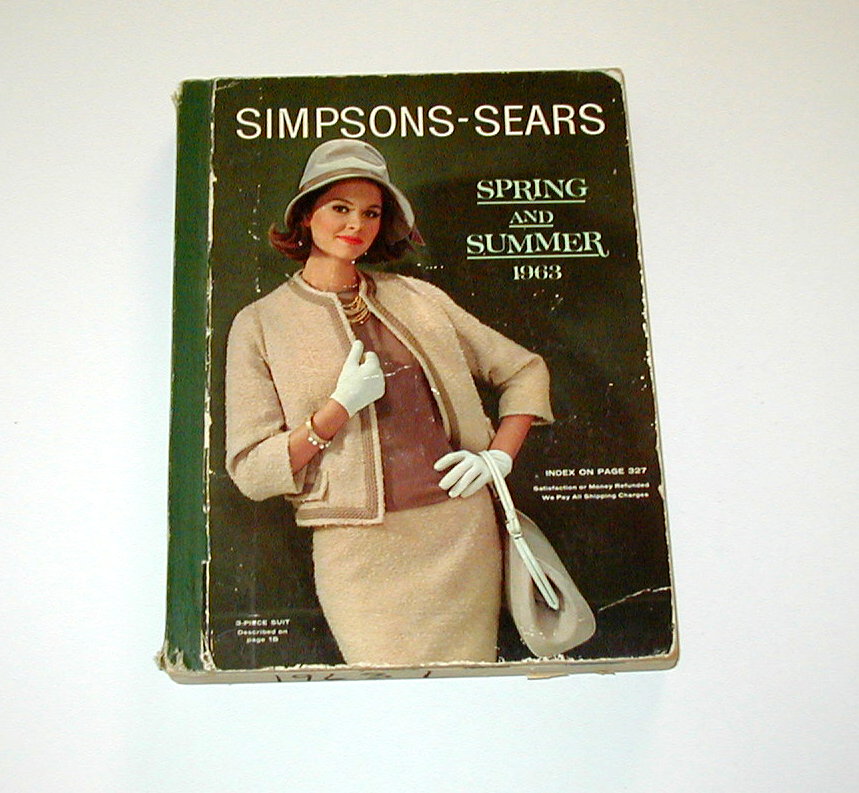 Illustrated below is a photo of the "Store Copy" version of the 1963 Simpsons-Sears Spring and Summer catalog. Note the "hard cover" thick cardboard front (and back) cover, and the green duct tape reinforced binding. Even though these catalogs took tons of abuse from shoppers daily leafing through their pages, many still exist to this day and are often highly desired by collectors.